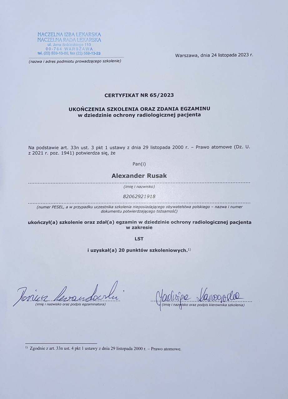 Обучение в области радиологической защиты пациента (сертификат NR 65/2023). Организатор: Naczelna Izba Lekarska